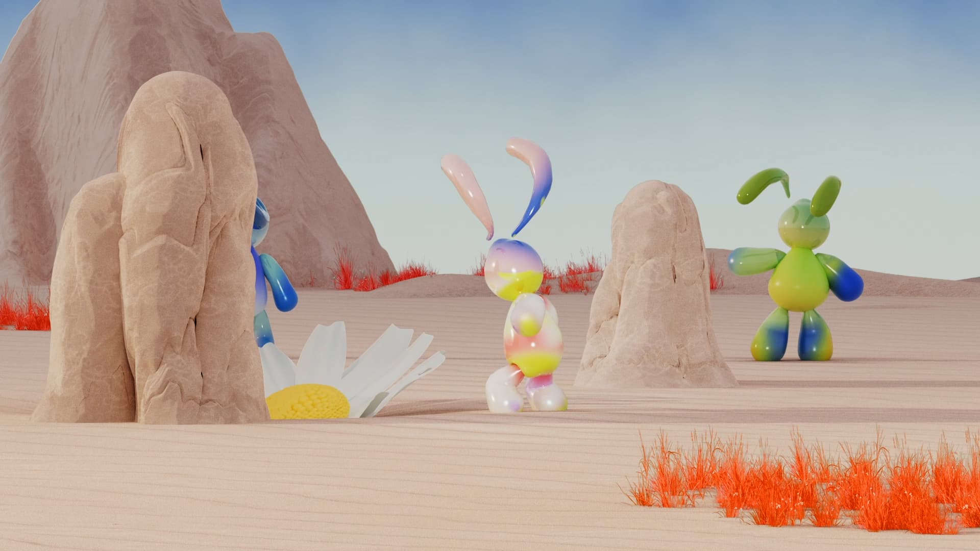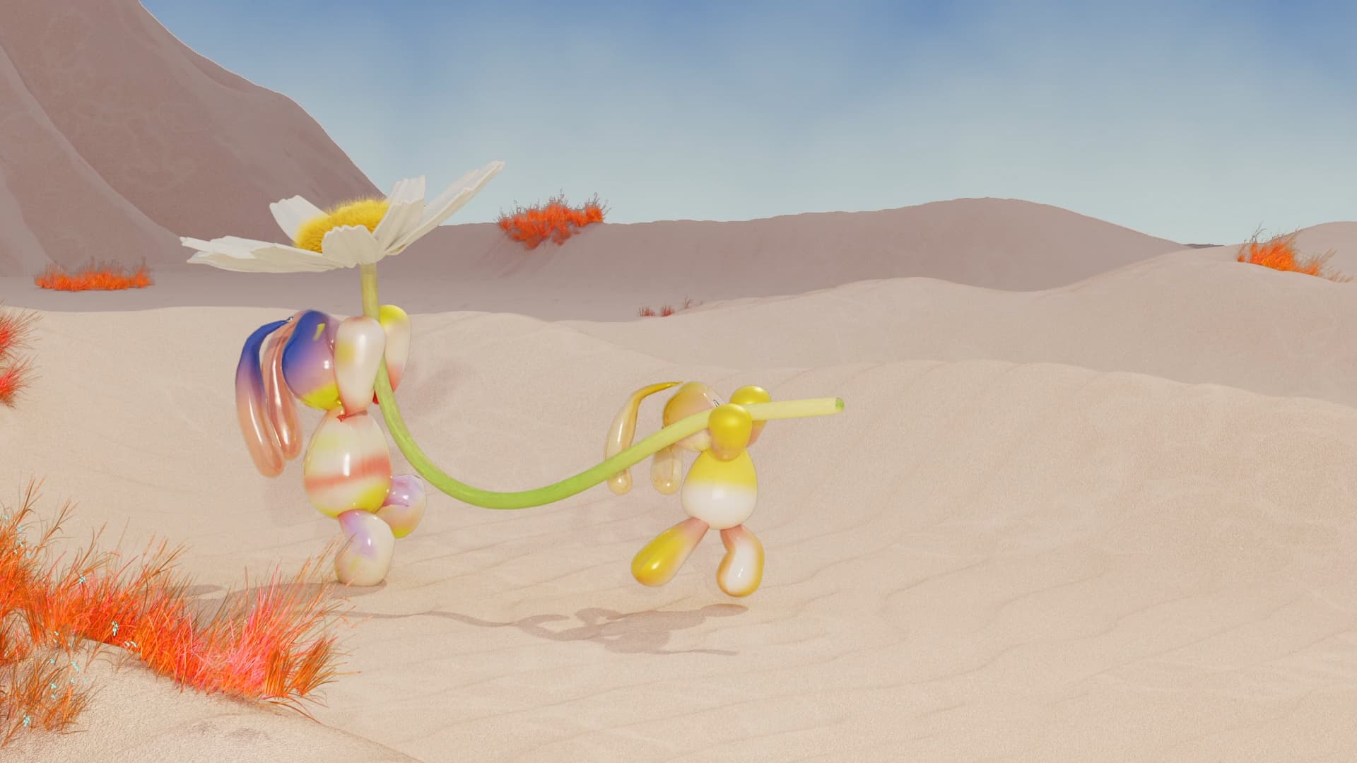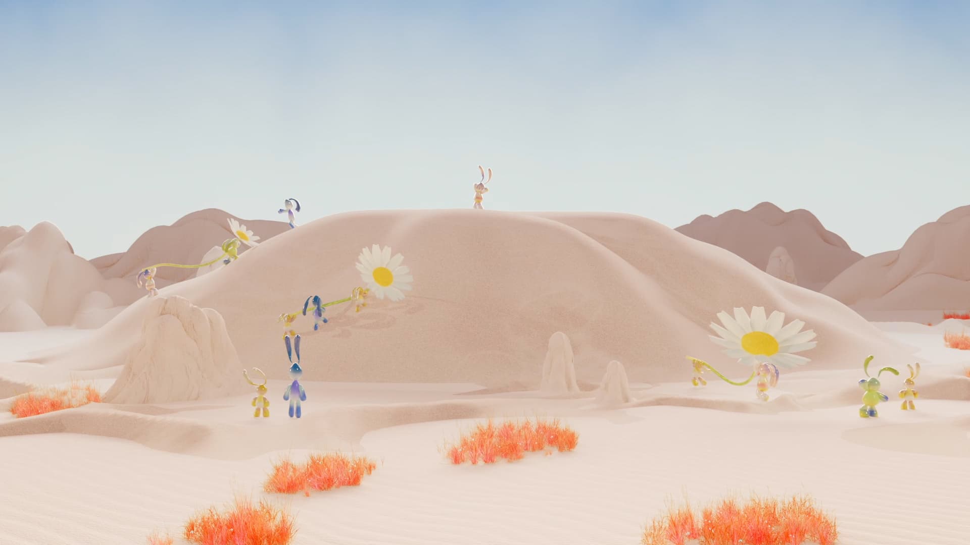In a deserted landscape, a cult of tiny creatures stumble across some giant flowers. When the inhabitants carry the heavy relics to their gathering site, the flowers form a large chain rising in the sky as the world suddenly bursts into new life with rainbows and meadows.