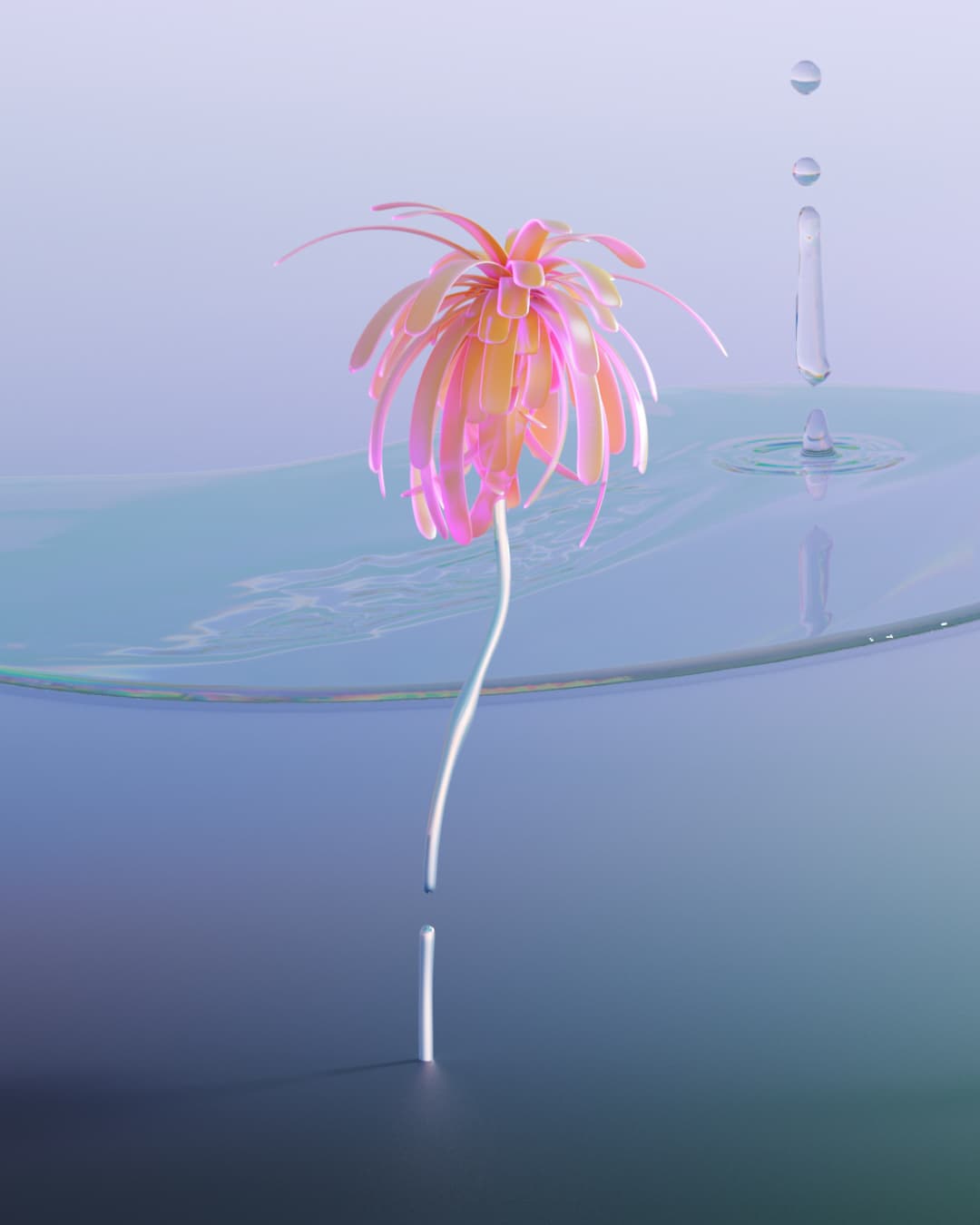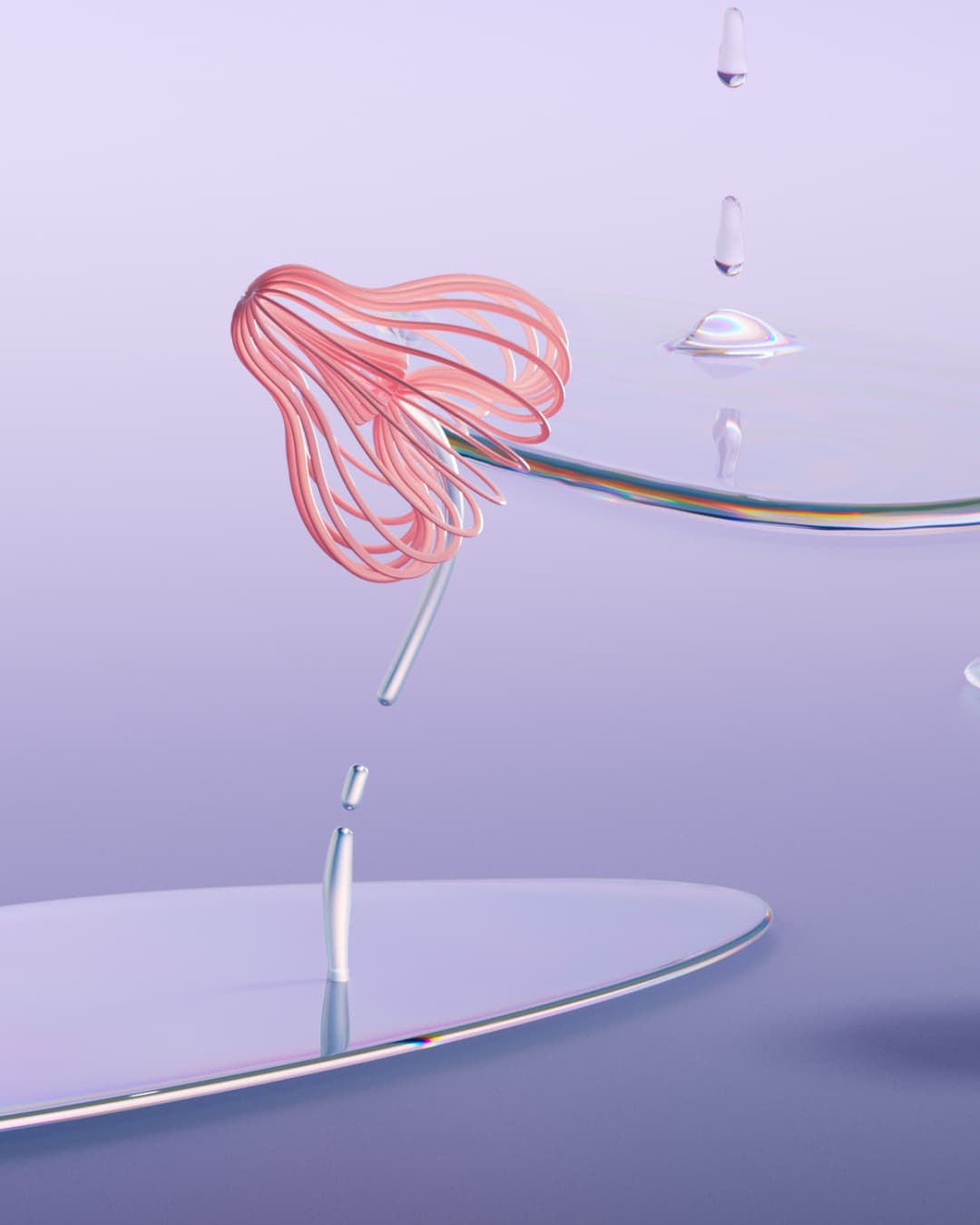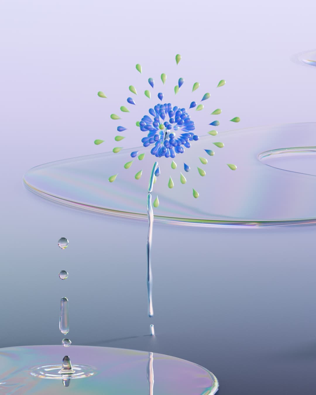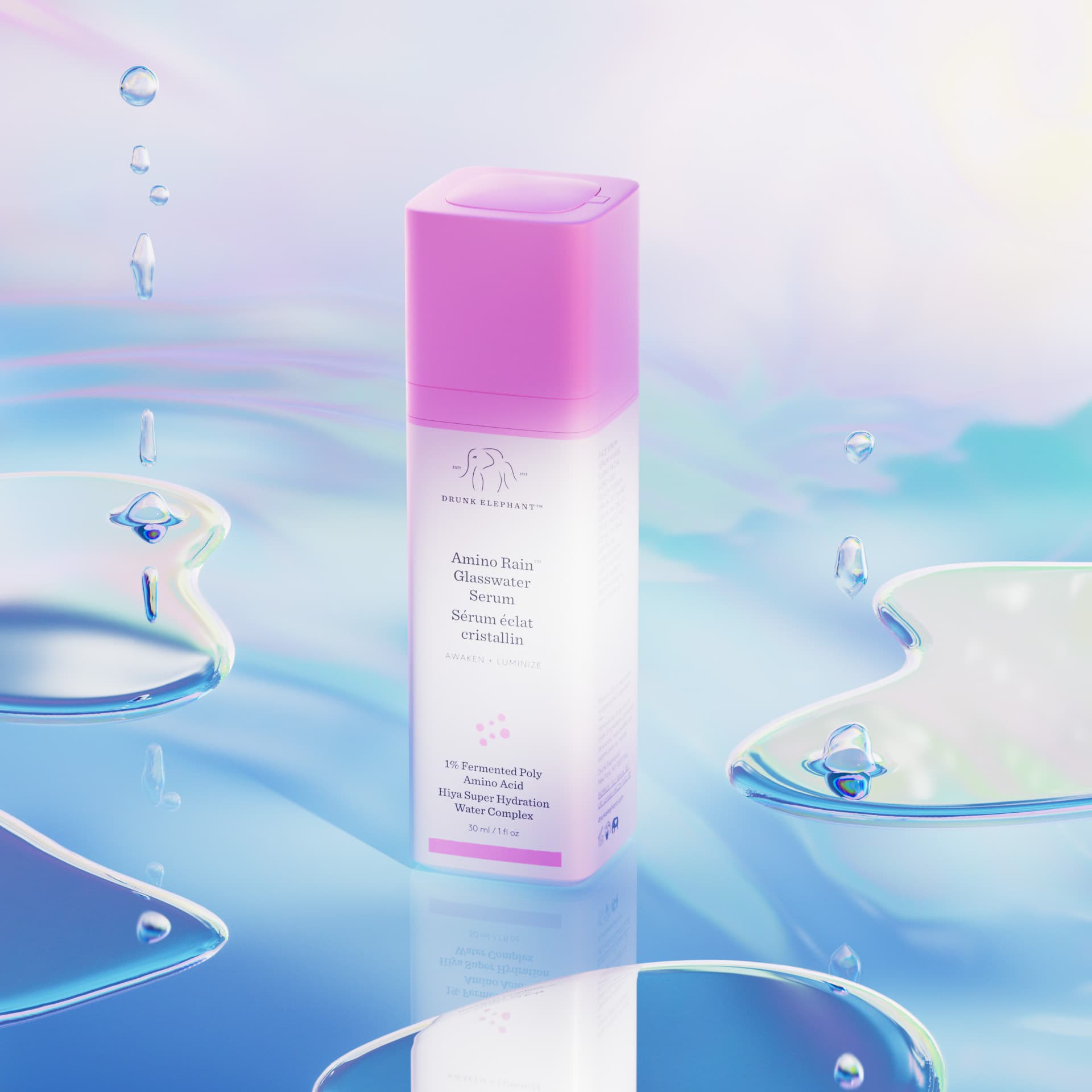 A full CGI and motion graphics product film for Drunk Elephant's new serum Amino Rain, drawing on the water cycle. In this 60 sec spot we run tests and analysis on the droplets before going big, drawing water up from pools on the floor, condensing droplets on amino acid structures in the sky, before falling back down to earth, forming their brand new Amino Rain serum